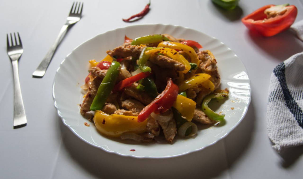 soğanı ve biberleri soteleyin. Sonrasında tavuk ve biberleri buluştup karıştırın. Tuzu ve diğer baharatları