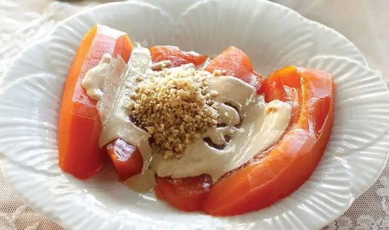 Kabak tatlısını ceviz, tahin ve kaymak gibi malzemelerle servis edebilirsiniz.