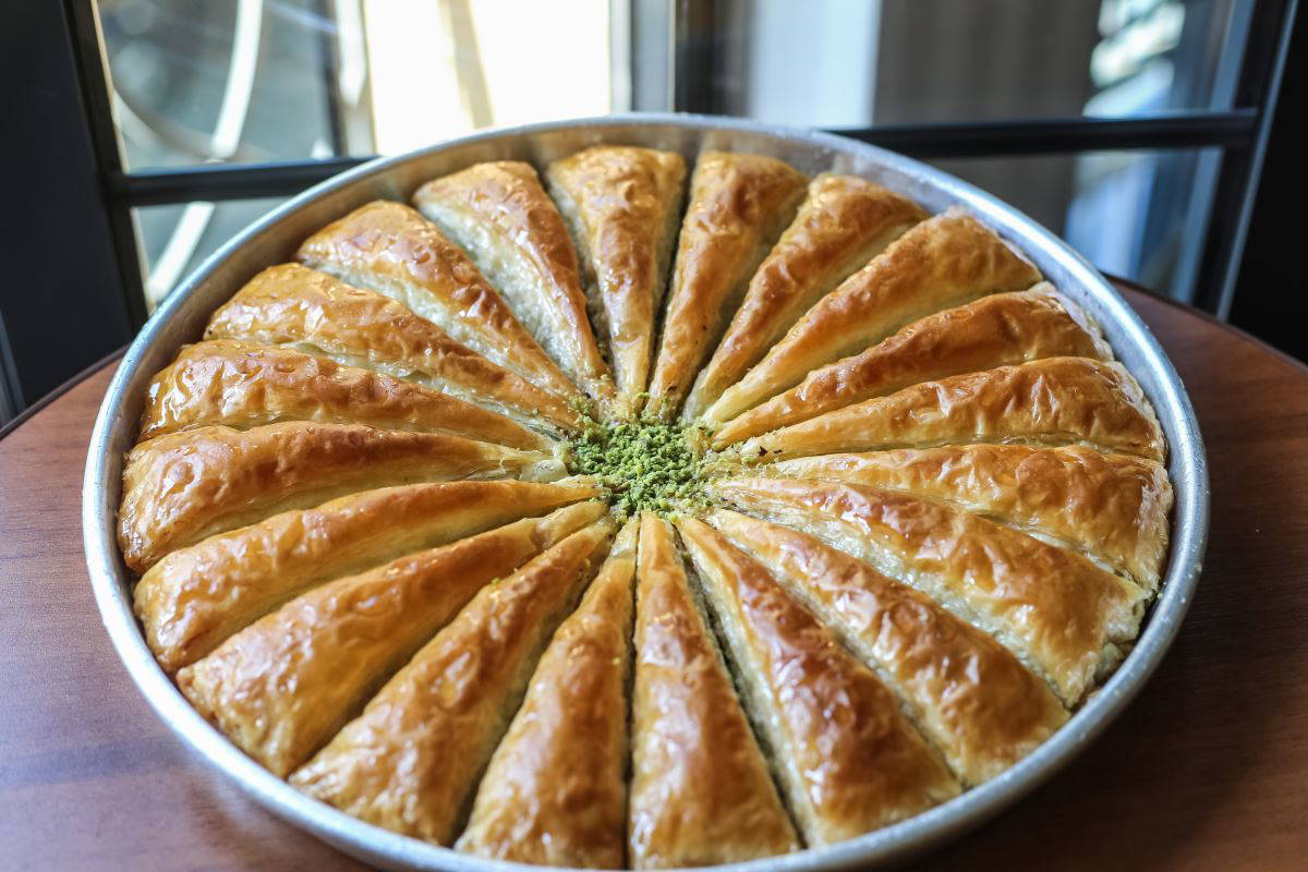 Öncelikle şerbeti için su, toz şeker ve limonu ocakta kısık ateşte 20 dakika kaynatın. Ocağın altını kapatıp, soğumaya bırakın. Tereyağı bir tavada eritin. İçine yarım çay bardağı sıvı yağ ekleyip, karıştırın. Baklava yufkalarını tezgaha alıp kullancağınız tepsinin ölçüsünde yuvarlak kesin. Verilen malzemeye göre 30 cm. çapındaki yuvarlak tepsi yeterli olacaktır. Tepsinin tabanını fırça yardımıyla tereyağı ile yağlayın. Yuvarlak kestiğiniz yufların aralarına tek tek tereyağı sürün. 20 kat serin. Üzerine bolca antep fıstığı serpin. Ardından diğer 20 kat yufkayı tek tek yağlayıp, serin. Sonra yufkaların kenarlarını pişerken kabarmasın diye sıkıştırın. Fırına atmadan tatlıyı üçgen şeklinde dilimleyin. Üzerine kalan tereyağını üzerine dökerek, her yerine yayılmasını sağlayın. 180 dereceli fırında kızarıncaya kadar pişirin. Baklava yufkası çabuk pişeceğinden kontrollü davranın. Fırından çıkan tatlının üzerine, ilk sıcağı çıkınca hazırladığımız ılık şerbeti dökün. Şerbeti çekene kadar en az 3-4 saat dinlendirin. Toz antep fıstığıyla süsleyip servis edebilirsiniz. Ayrıca vanilyalı dondurma ile tüketebilirsiniz. Afiyet olsun.