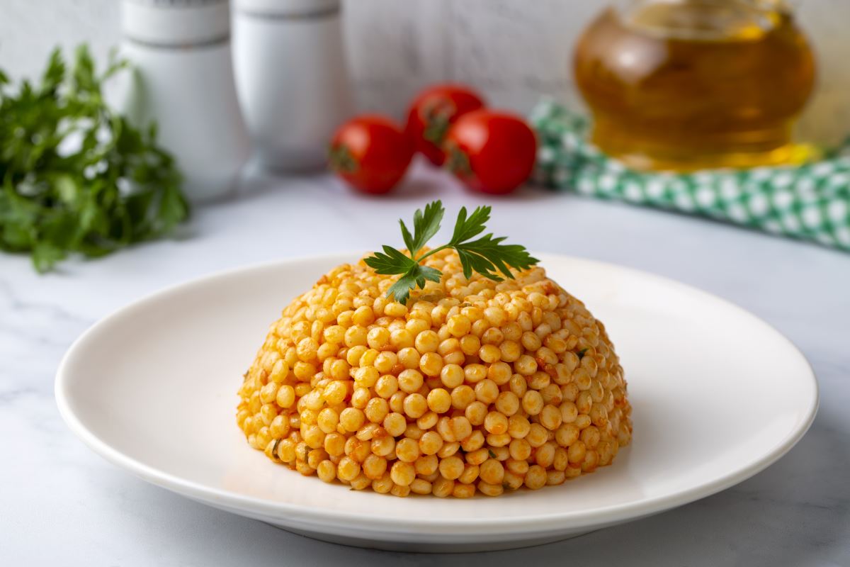 Pilav tenceresinde tereyağı ve zeytinyağını kızdırıp ince ince doğradığınız biberi ekleyin ve yumuşayana kadar kavurun. Rendelenmiş domatesi ekleyip birkaç dakika pişirin. Kuskusu ekleyin. Suyunu ve tuzunu ilave edip karıştırın ve kapağını kapatıp suyunu çekene kadar pişirin. İftar için pilavınız hazır, afiyet olsun.