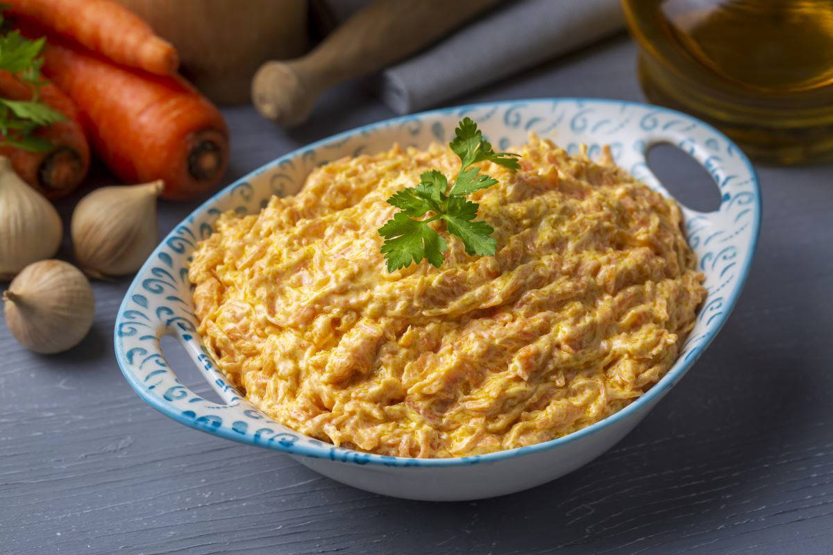 Öncelikle havuçların kabuğunu soyup, rendeleyin. Zeytinyağını tavaya alın ve havucu ekleyip soteleyin. Sarımsakları ekleyip biraz daha soteleyin. Havuçlar kavurulunca soğuması için kenara alın. Geniş bir kaseye havuçları alın. Süzme yoğurdu ilave edip karıştırın. Cevizleri ve zeytinyağını ekleyip tekrar karıştırın. Servis tabağına alıp, maydanozla süsleyip soğuk olarak servis edin. İftar için, havuç tarator hazır, afiyet olsun.