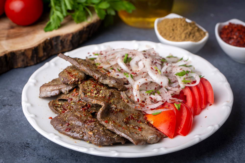 Yaprak ciğeri; sumak, tuz ve ince doğranmış maydanozla karıştırılmış kırmızı soğanla birlikte servis edin.