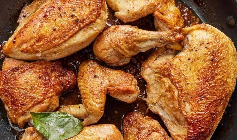 - Sosu ekleyin: Tavuklar kızardığında, marine sosu, sirke, su, defne yaprağı ve toz şekeri ekleyin. Tüm malzemeleri iyice karıştırın.