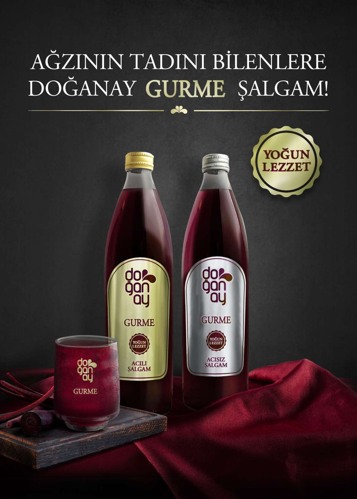 Yoğun lezzeti ile tüm Türkiye’ye şalgamı sevdiren Doğanay, yeni bir ürünle daha şalgamla gelen lezzeti sofralarla buluşturuyor. Tarifine daha fazla mor havuç ve sarımsak eklenmesiyle daha yoğun bir tada kavuşuyor. Doğanay Gurme Şalgam acılı ve acısız çeşidi ile etli yemeklerden zeytinyağlılara, dolmalardan balıklara her yemeğin en favori eşlikçisi oluyor ve yemeklere hem lezzet hem de sağlık katıyor. Daha yoğun enfes tadı ve şık cam şişesi ile her yemeğin yanına yakışan şalgam, sofraların vazgeçilmezi olmaya hazır. Gurme sofraların eşlikçisi olan Doğanay Gurme Şalgam’ı dilediğiniz her yemeğin yanında tüketebilirsiniz. Etli yemeklerden balıklara, zeytinyağlılardan köfteli yemeklere ve tüm dolma çeşitlerine çok yakışıyor. Gazsız ve şekersiz olduğu için de şişkinlik yapmıyor, kolay içiliyor. Yararlı dost bakterilerle fermente olan ve bu sayede hazmı kolaylaştıran şalgam tarifine eklenen daha fazla mor havuç ve biraz da sarımsak ile gurme bir lezzete dönüşüyor.