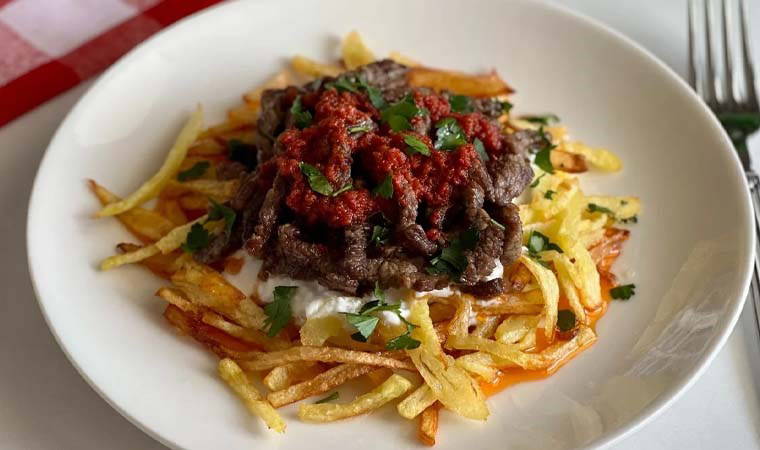 - Servis tabağına patatesleri yayın. Üzerine etleri yerleştirip sarımsaklı yoğurt gezdirin. Sos ekleyin ve maydanoz ile süsleyin. Şimdiden afiyet olsun.