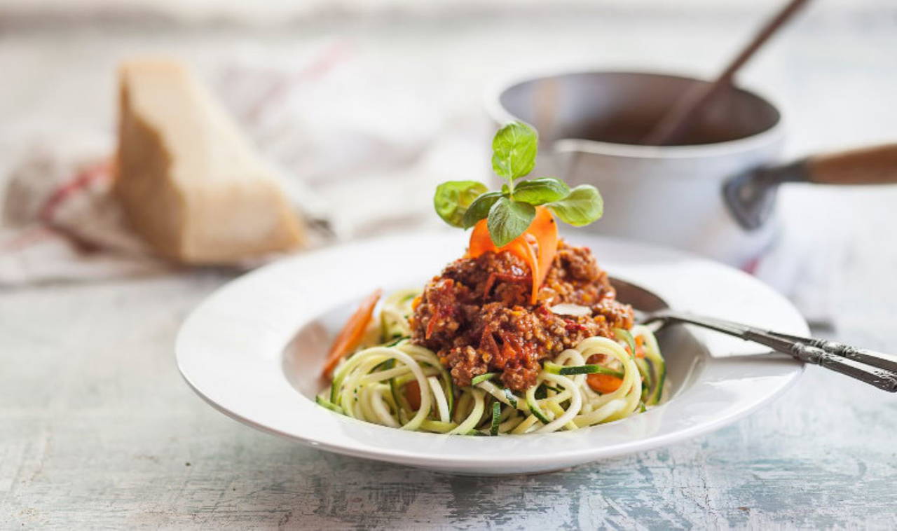 Kabakları spiral kesme aparatıyla spagetti şeklinde rendeleyin. Tavaya alın, biraz zeytinyağı, biraz su ve tuzla yüksek ateşte 10 dakika pişirin. Kıyma sosu için, soğanla birlikte kıymayı kavurun. Salçayı ve sarımsakları ilave edin. Baharatları ekleyin, bir kaç dakika daha pişirmeye devam edin. Kabakları tabağa koyup üzerine kıyma sosu ilave edin.