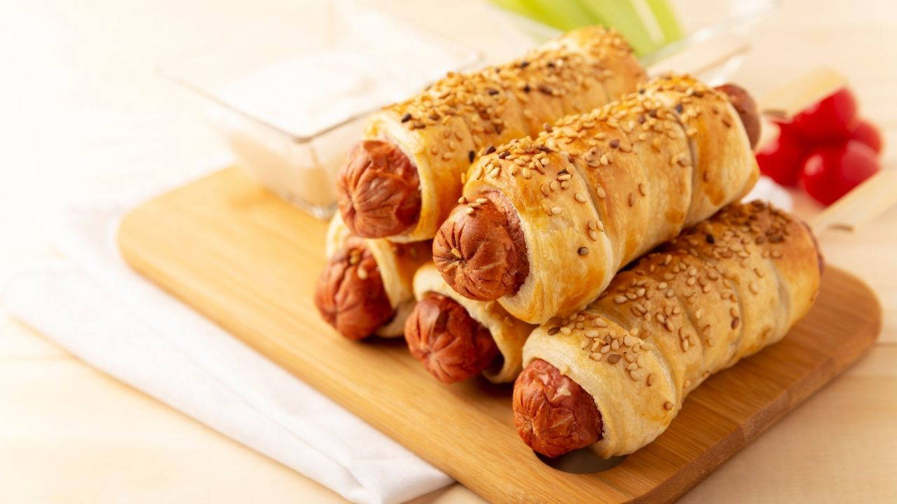 - Milföy hamurunu sosisin etrafına sarın ve kapatın.