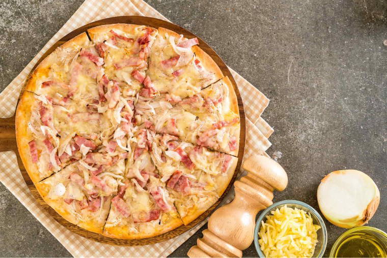 Flammkuchen’in hamuru pizzadan daha ince olmalıdır.