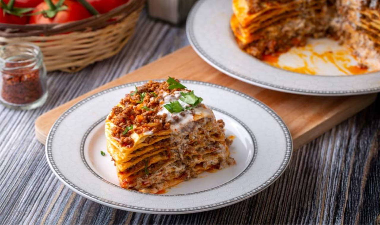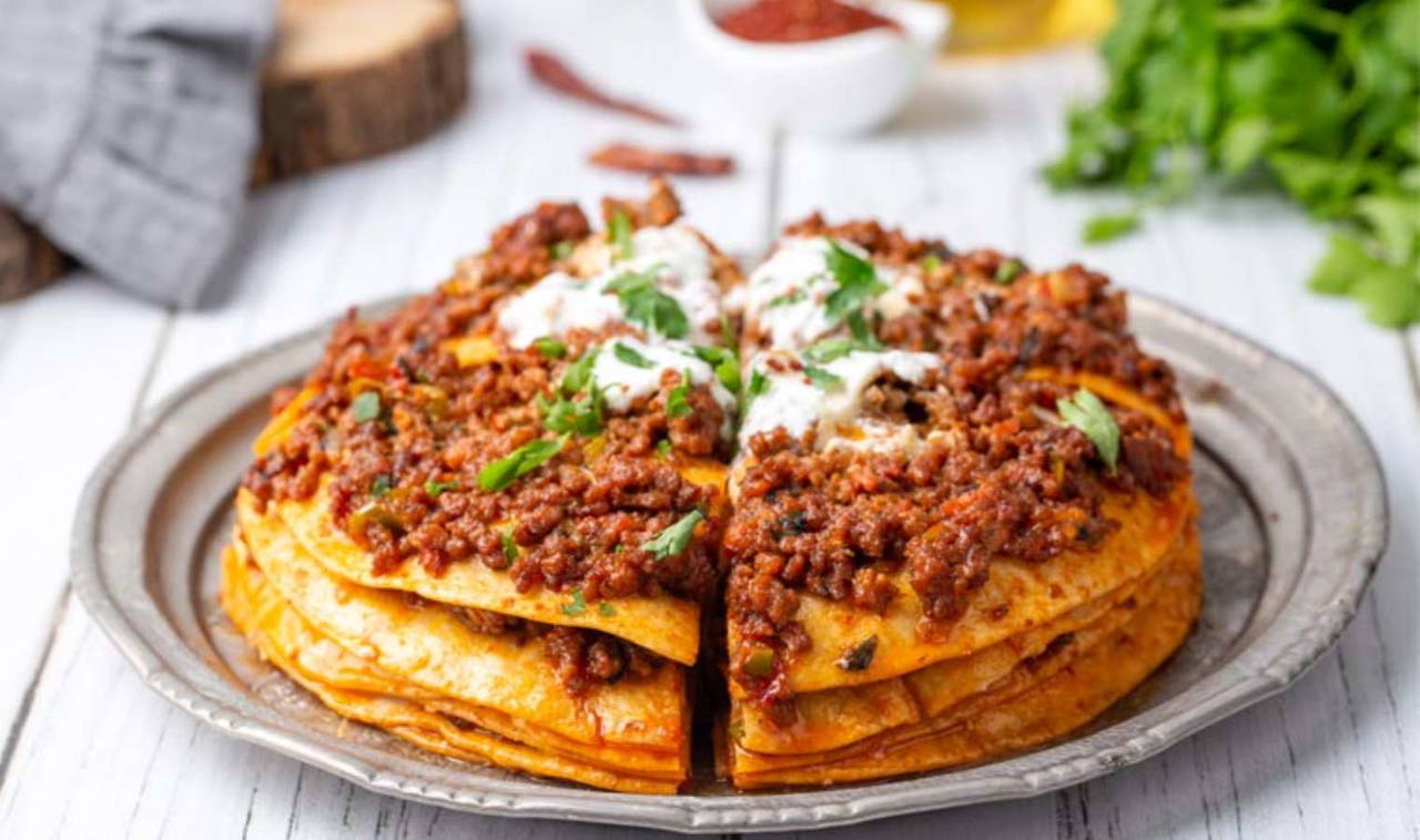 Hamur ve iç harcı birleştirmek için: Mayalanan hamuru tezgahın üzerine alın. Bezeler haline getirin ve üzerini bir bezle kapatarak 10-15 dakika mayalanmaya bırakın. Oklava yardımıyla hafif unlayıp bezeleri servis tabağı boyutunda tek tek açın. Hamurun üzerindeki unları silkeleyin. Yapışmaz bir tavayı ocağın üzerine alın ve iyice ısıtın. Isınan tavaya açtığınız hamurları tek tek aktarın ve arkalı önlü pişirin. Tüm hamura aynı işlemi uygulayın. Tüm yufkaları pişirdikten sonra bir pişmiş yufka ardından hazırladığınız kıymalı iç, ardından tekrar yufka sıralamasıyla kat çıkın.Tüm iç harç ve yufkalar bittiğinde üzerini sarımsaklı yoğurt ve ince kıyılmış maydanozla süsleyin ve dilimleyerek servis edin. Afiyet olsun!