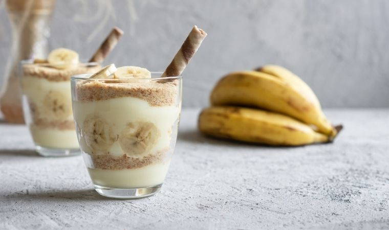 Üzerine dilimlenmiş muzlar ve isteğe bağlı olarak dövülmüş ceviz içi veya fındık içi serpiştirilir.