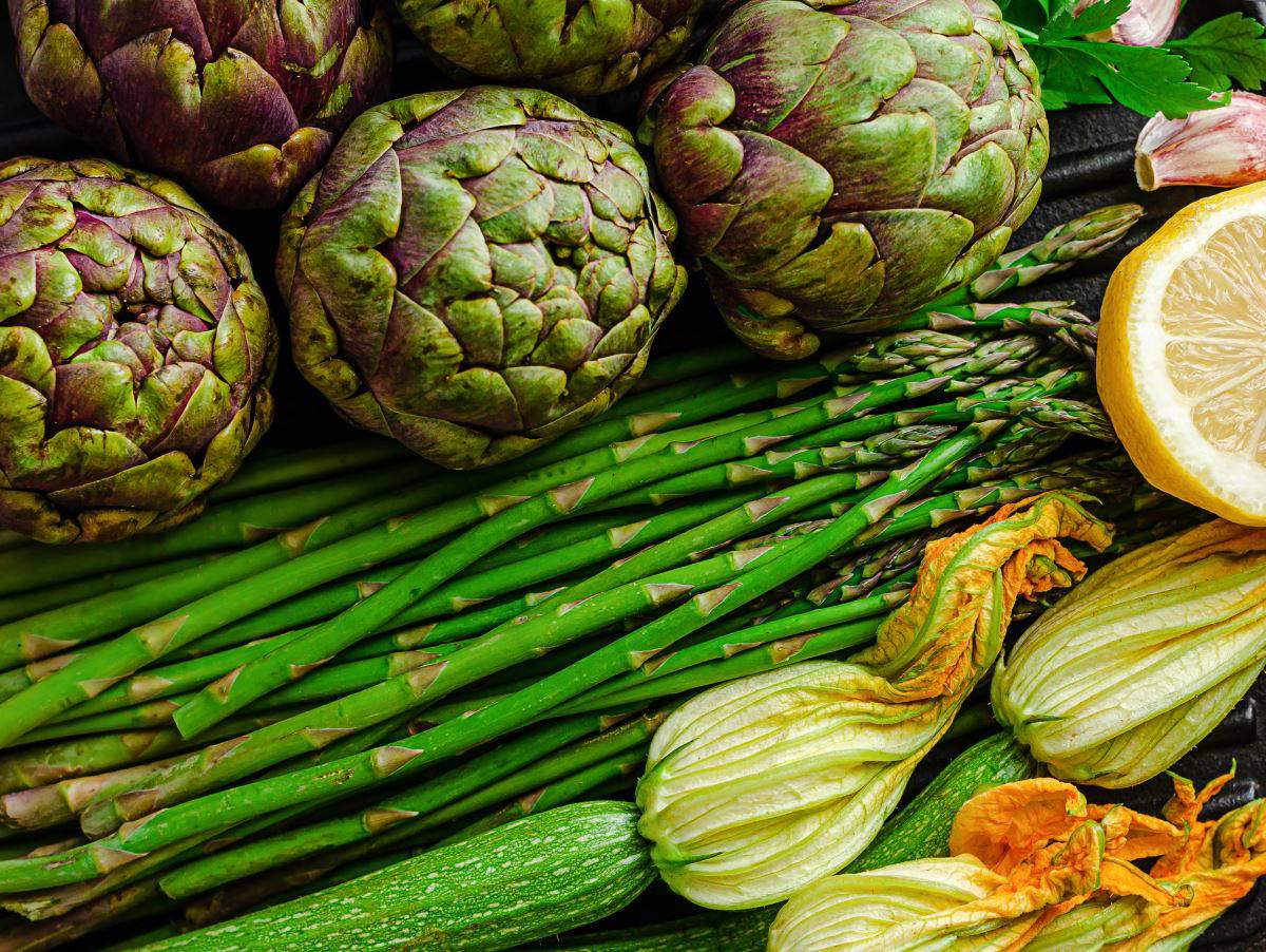 Enginar, kuşkonmaz, taze bakla, bezelye, barbunya, arpacık soğan, taze sarımsak, semizotu, madımak, deniz börülcesi, ebegümeci, hindiba, ısırgan.