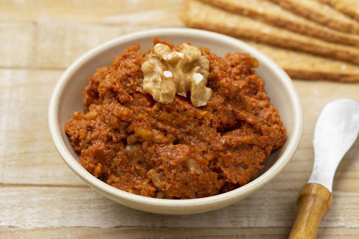 Öncelikle kırmızı biberleri közleyin. Kabuklarını soyup, çekirdeklerini ayıkladıktan sonra mutfak robotuna alın. Bütün malzemeleri ekleyip karıştırın. Servis kabına alın. Üzerini ceviz veya maydanozla süsleyip, servis edebilirsiniz. Afiyet olsun.