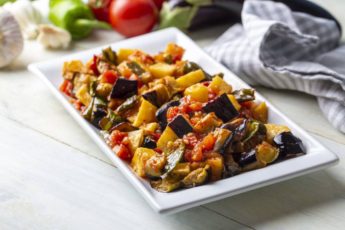 Öncelikle patlıcanları alacalı soyduktan sonra küp küp doğrayın. Tuzlu su dolu bir kaba alıp, acısının geçmesi için bekletin. Diğer sebzeleri de küp küp doğrayın. Geniş bir tavada sıvı yağı kızdırın. Tüm sebzeleri ayrı ayrı kızartın. Sosu için gerekli olan domatesleri doğrayın. Bir sos tavasına aldığınız zeytinyağında domatesleri hafifçe kavurmaya başlayın. Üstüne rendelenmiş sarımsak, tuz, şeker ve sirkeyi de ekledikten sonra kapağını kapatın ve sos kıvamına gelene kadar, ara ara karıştırarak pişirin. Hazırladığınız sosu, kızarttığınız sebzelerin üstüne gezdirin. Karıştırıp servis edebilirsiniz. Afiyet olsun.