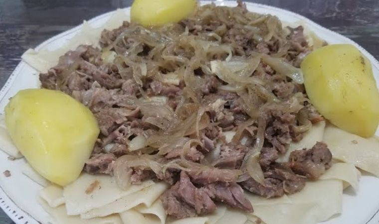 - Servis tabağına önce pişen hamurları yerleştirin. Üzerine didiklenmiş ya da dilimlenmiş etleri ekleyin. İnce dilimlenmiş soğanlarla süsleyip sıcak servis edin.