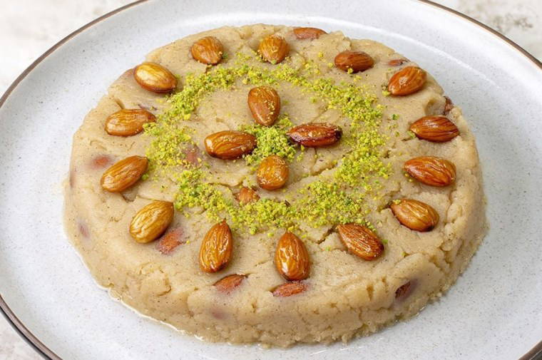Hazırladığınız helvaya dilediğiniz şekli verip üzerini bademlerle süsleyin.