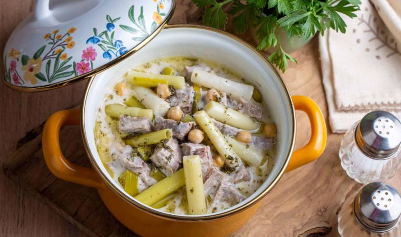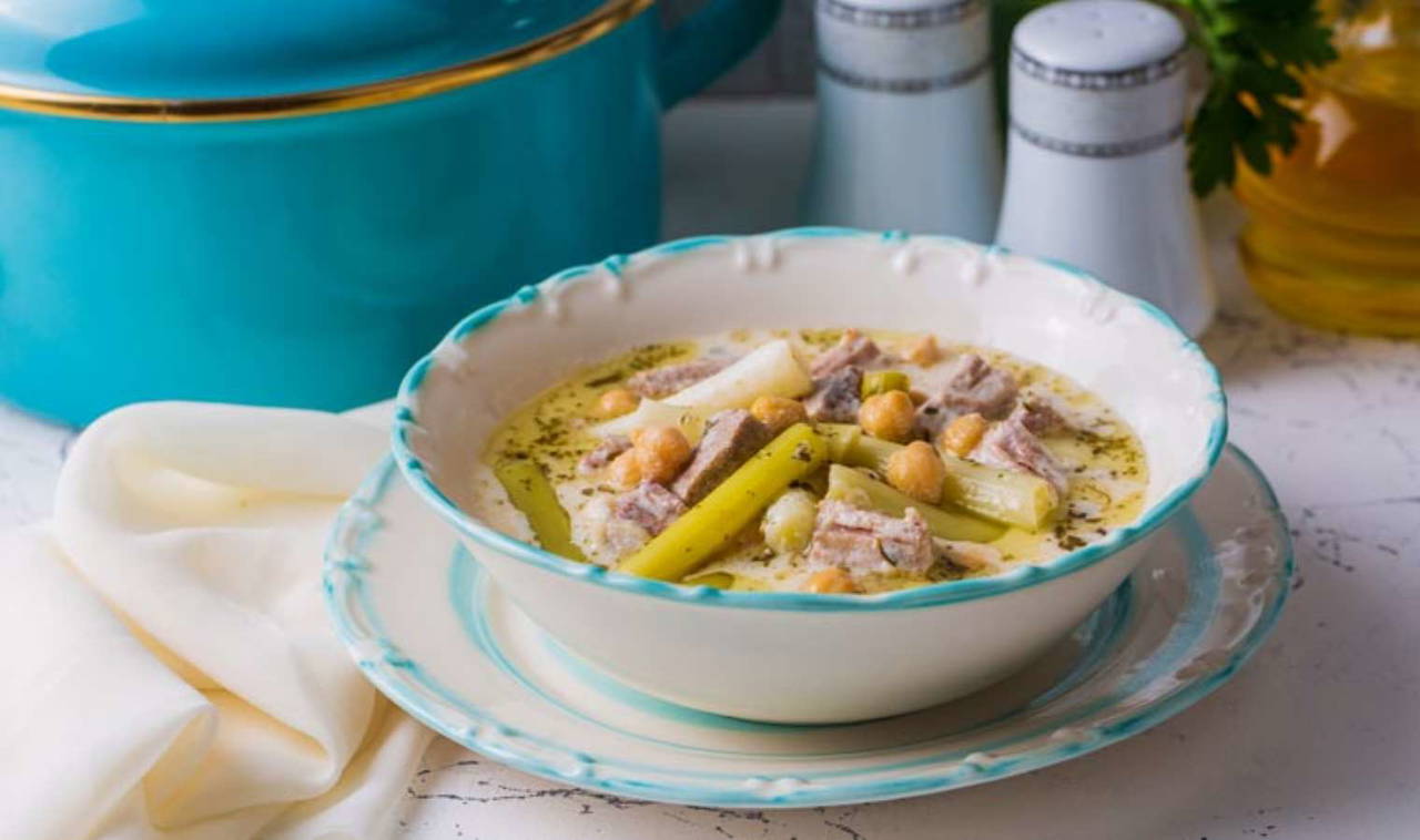 Öncelikle kuşbaşı doğranmış kuzu etini tencereye alın. Üzerini hafif geçecek kadar su ekleyin ve suyunu çekene kadar pişirin. Zeytinyağını ekleyip birkaç dakika daha pişirin. Taze sarımsakları beyaz kısımlarını 3’er santimlik parçalar şeklinde kesin. Malzemelerin üzerini geçecek kadar sıcak suyla birlikte tencereye ilave edin. Yumuşayana kadar pişirin. Haşlanmış nohutları ekleyip 10 dakika daha pişirin. Bir kasede süzme yoğurt, un ve yumurta sarısını ekleyip çırpın. Yemeğin sıcak suyundan yavaş yavaş ilave ederek yoğurdu ılıştırın. Karışımı azar azar tencereye ilave edip 5 dakika daha pişirin. Tuzla tatlandırın. Üzeri için tereyağını eritip, naneyi ekleyin. Yemeğin üzerine gezdirip servis yapın. Afiyet olsun.