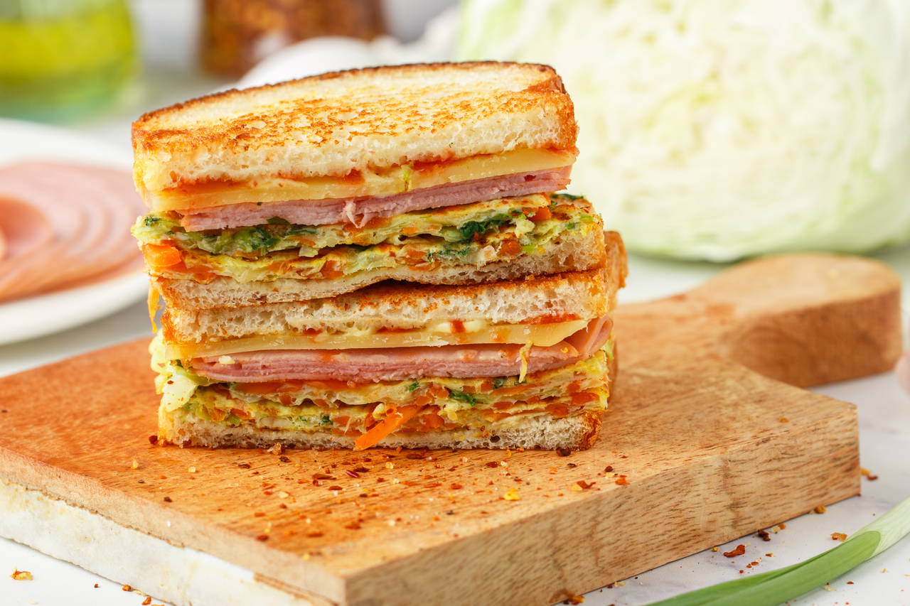 Kızaran ekmek dilimlerinin üzerine sırasıyla sebzeli yumurta, peynir ve jambon ekleyin.