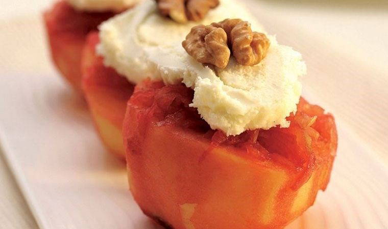 - Her bir ayva yarısının üzerine kaymak ekleyin ve dövülmüş ceviz veya fındık serpiştirin.