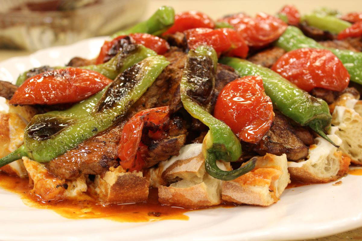 Öncelikle derin bir kabın içine kıyma, soğan rendesi, ufalanmış pide, galeta unu, baharatlar, yumurta, sarımsak ve zeytinyağı çok iyi yoğurun. Karışımı buzdolabı poşetine koyup, dondurucuda 2 saat kadar bekletin. Donan harcı bıçakla ince kesip yağsız tavada pişirin. Sosu için gerekli tüm malzemeleri bir tavaya alın. 5 dakika kaynatıp, kenara alın. Servis için pideleri ısıtın. Üzerine pişen döneri, sosunu ekleyin. En son kızgın tereyağını ekleyip, közlenmiş biber domatesle servis edin.