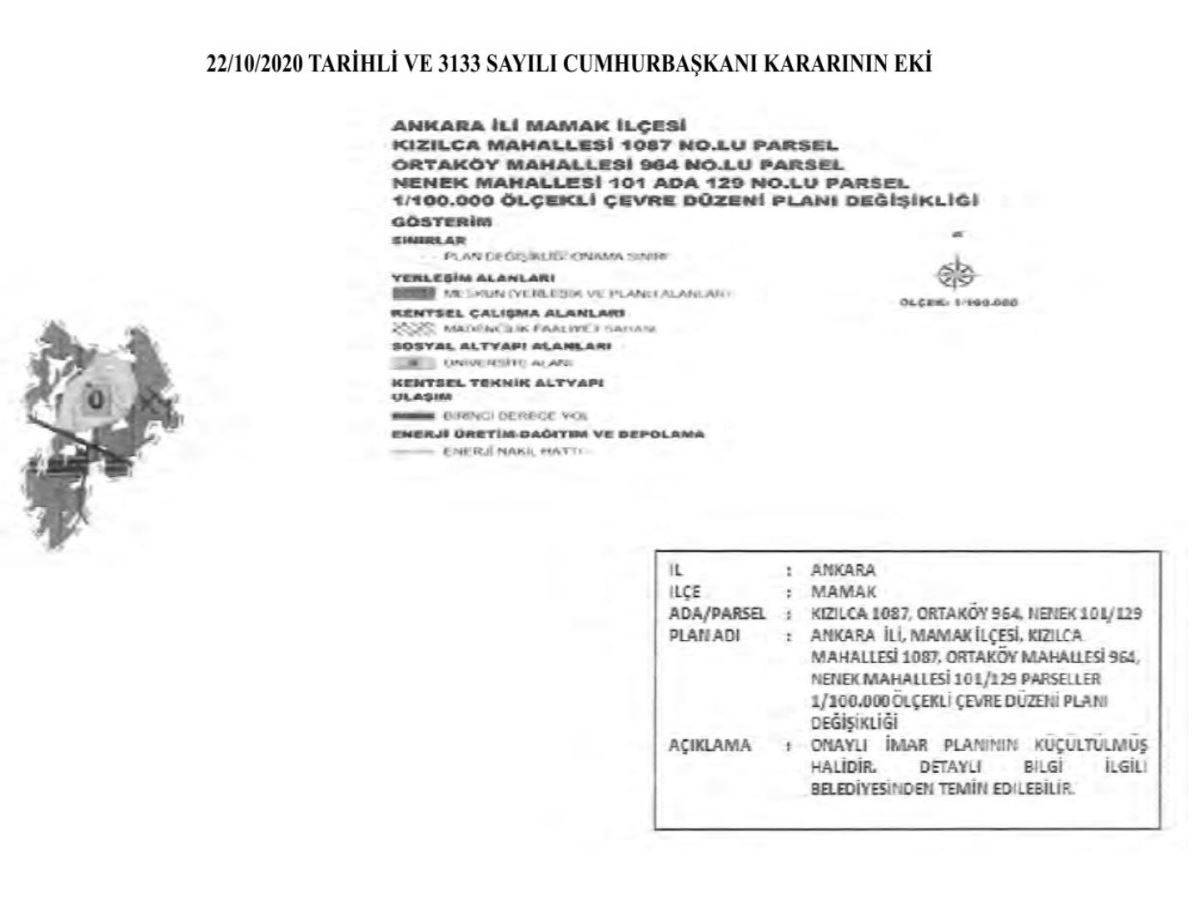 BAŞKENT’İN GÖBEĞİNDE MADEN SAHASI: Mülkiyeti Hazine’ye ait olan Ankara’nın Mamak ilçesindeki Kızılca Mahallesi’nde bulunan 1087 parsel, Ortaköy Mahallesi’nde bulunan 964 parsel ve Nenek Mahallesi’ndeki 101 ada 129 parsele ilişkin Özelleştirme İdaresi Başkanlığı’nın hazırladığı “Kentsel Meskun Alan, Üniversite Alanı ve Madencilik Faaliyet Sahası”nı içeren nazım ve uygulama imar planları Cumhurbaşkanı Recep Tayyip Erdoğan tarafından onaylandı. Alanda yapılacak konutlar, ticaret tesisi, okul, sağlık tesisi, sosyal tesis, park ve maden sahası konusunda Özelleştirme İdaresi Başkanlığı yetkili kılındı.