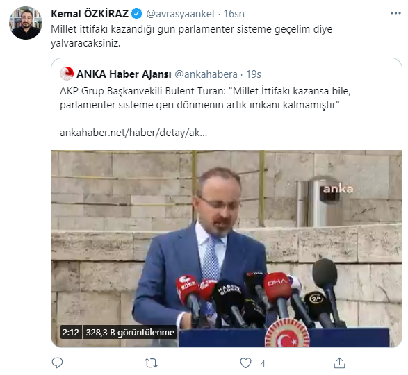 Özkiraz, kişisel Twitter hesabından Turan'ın paylaşımına "Millet ittifakı kazandığı gün parlamenter sisteme geçelim diye yalvaracaksiniz" yanıtını verdi.