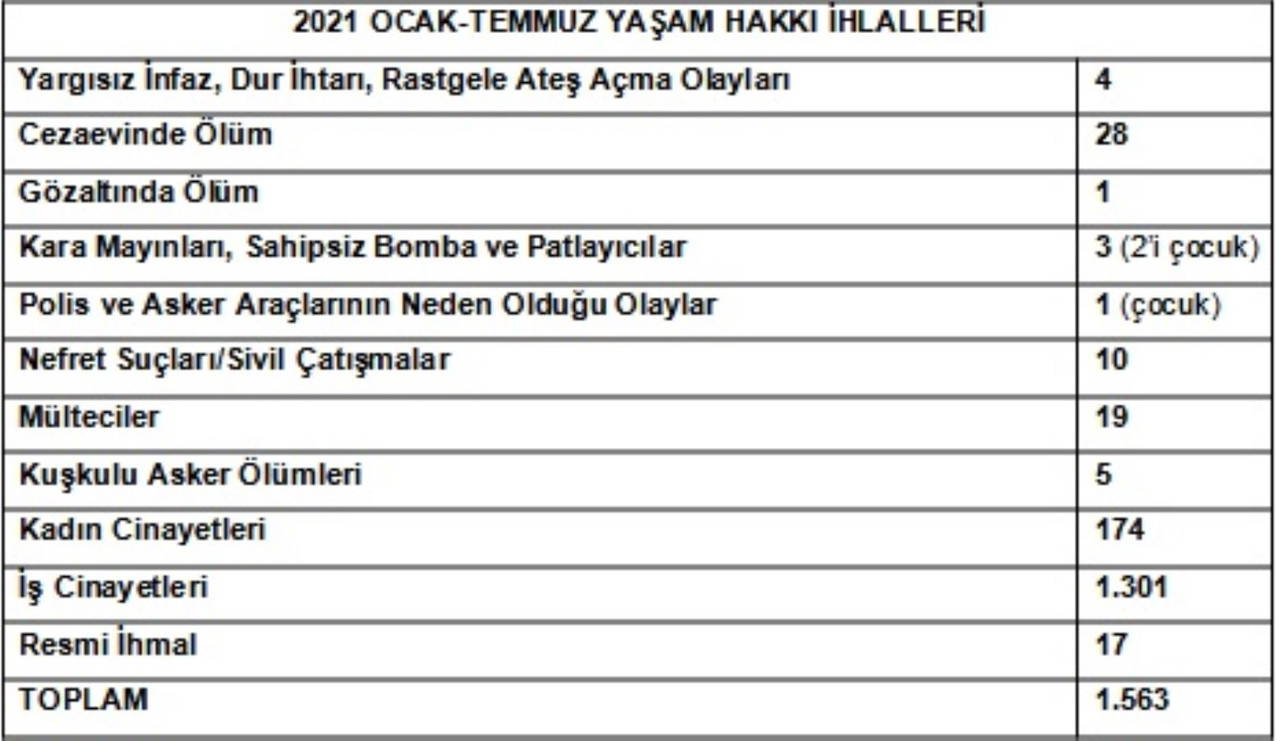 Tanrıkulu'nun açıklamasına göre, Türkiye’de 2021 yılının ilk 6 ayında en az bin 540 kişinin yaşam hakkı ihlal edildi.