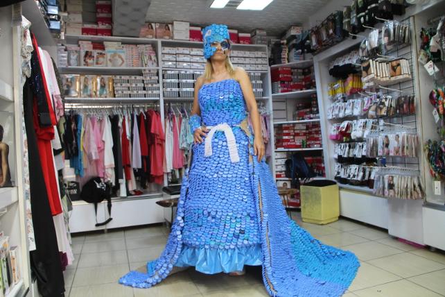 Amasya’nın Merzifon ilçesinde esnaflık yapan Elif Kılıç: “Çevre ve Şehircilik Bakanlığının Sıfır Atık projesi kapsamında çıtayı bir tık daha yükseltip, tamamıyla çöp kabul ettiğimiz kapaklardan oluşan bir elbise yapmaya kara verdim. Neden kapaklar, çünkü çok zararlı görünmeyen ve atmaktan çekinmediğimiz kapaklarla çevreye vermiş olduğu zararın boyutunu farklı bir şekilde sanatsal bir şekilde ifade etmek ve bir anlamda farkındalık yaratmak istedim. Proje nasıl başladı, öncelikle kapak ihtiyacımı sosyal medyadan duyurdum. Eş, dostla başlayan kapak bağışı daha sonra tüm ile yayılmaya başladı. Projenin her aşamasını mümkün olduğu kadar sosyal medyadan paylaştım. Eser oluşmaya başladıkça ilgi büyüdü, ilgi büyüdükçe de şevkimiz arttı. Sonuç itibariyle atmak yerine biriktirmeyi tercih ettiğimizde böyle bir eser çıkarmış olduk il bazında. Biz hazır böyle bir şeye kalkışmışken rekorsel anlamda bir eser ortaya çıksın istedik. 10 bin tane kapak tek tek elde dikilerek yapıldı. 10 bin civarı kapak şu an elbisemizde mevcut, ortalama 10-13 kilogram ağırlığında bir elbisemiz var” dedi.
