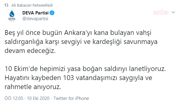 Deva Partisi, Ankara Tren Garı katliamında yaşamını yitirenler için anma mesajı yayınladı. Partinin sosyal medya hesabından yapılan paylaşımda, denildi. "Beş yıl önce bugün Ankara’yı kana bulayan vahşi saldırganlığa karşı sevgiyi ve kardeşliği savunmaya devam edeceğiz. 10 Ekim’de hepimizi yasa boğan saldırıyı lanetliyoruz. Hayatını kaybeden 103 vatandaşımızı saygıyla ve rahmetle anıyoruz"