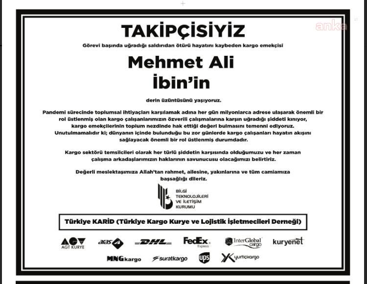 Tayfun Ş. tarafından öldürülen Mehmet Ali İbin için, Türkiye Kargo Kurye Lojistikçileri İşletmecileri Derneği çatısı altındaki 10 kargo şirketi ile Bilgi Teknolojileri ve İletişim Kurumu gazeteye büyük boy ilan verdi. İlanda “Kargo sektörü temsilcileri olarak her türlü şiddetin karşısında olduğumuzu ve her zaman çalışma arkadaşlarımızın haklarının savunucusu olacağımızı belirtiriz” denildi.