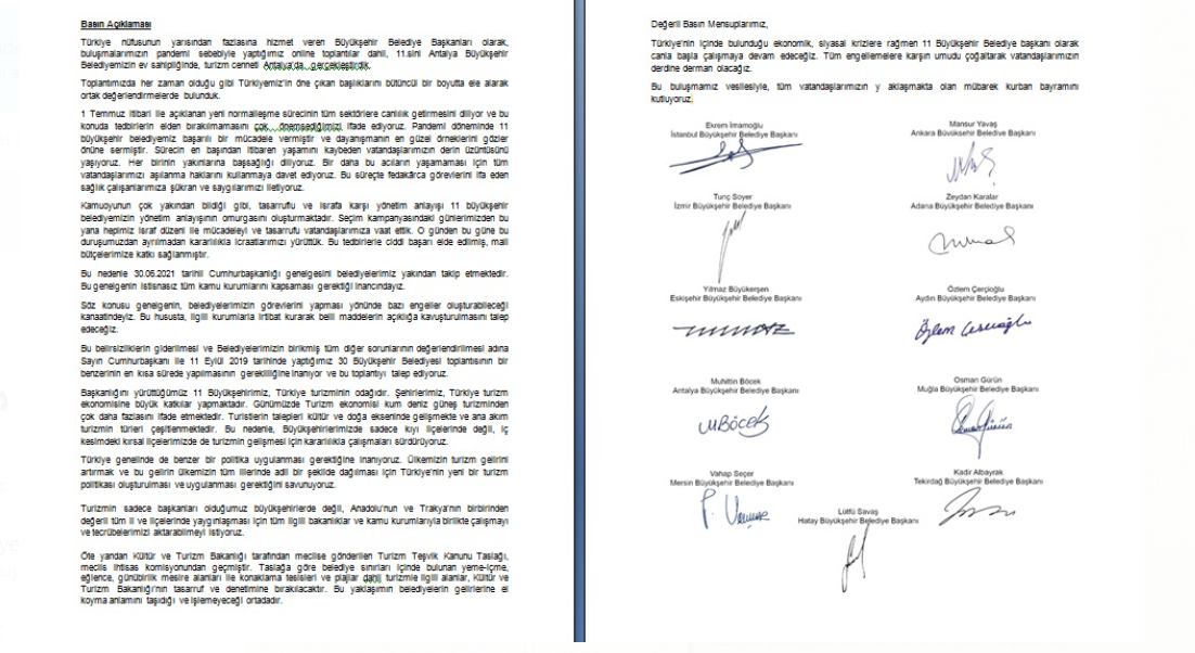 İstanbul Büyükşehir Belediye Başkanı Ekrem İmamoğlu, Ankara Büyükşehir Belediye Başkanı Mansur Yavaş, İzmir Büyükşehir Belediye Başkanı Tunç Soyer, Adana Büyükşehir Belediye Başkanı Zeydan Karalar, Eskişehir Büyükşehir Belediye Başkanı Yılmaz Büyükerşen, Aydın Büyükşehir Belediye Başkanı Özlem Çerçioğlu, Antalya Büyükşehir Belediye Başkanı Muhittin Böcek, Muğla Büyükşehir Belediye Başkanı Osman Gürün, Mersin Büyükşehir Belediye Başkanı Vahap Seçer, Tekirdağ Büyükşehir Belediye Başkanı Kadir Albayrak ve Hatay Büyükşehir Belediye Başkanı Lütfi Savaş’ın katılımlarıyla gerçekleşen toplantının ardından bir açıklama yayınlandı.