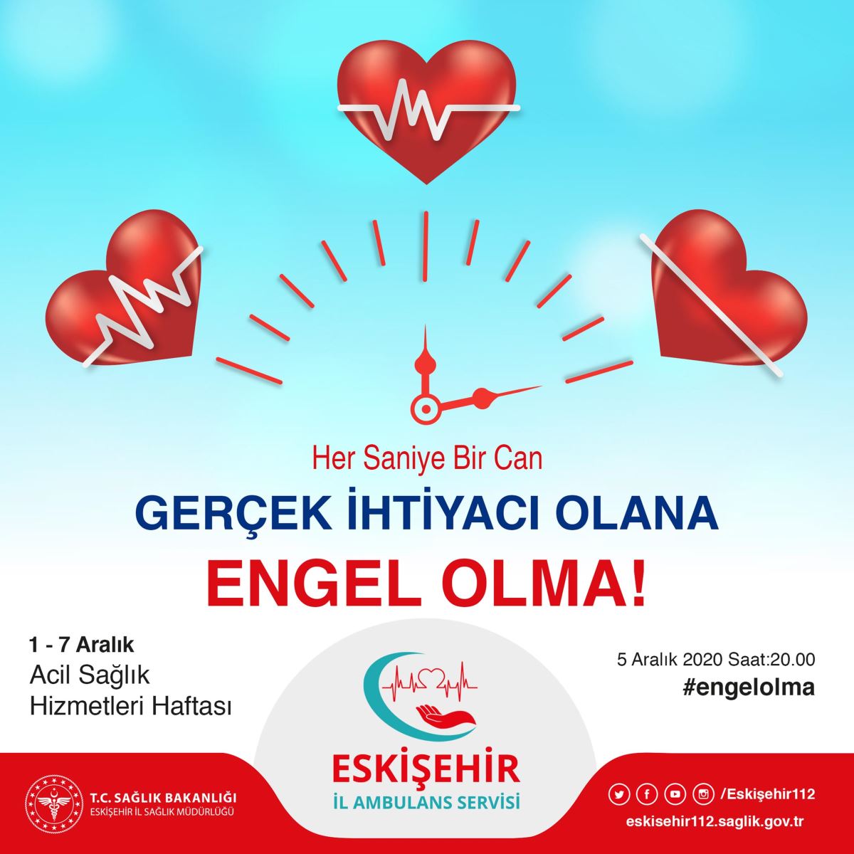 Eskişehir 112 Ambulans Servisi Başhekimliği’nce 1-7 Aralık Acil Sağlık Hizmetleri Haftası kapsamında Twitter’da, 5 Aralık saat 20.00’de ‘#engelolma’ etiketiyle paylaşımlar yapılarak, gereksiz çağrıların önüne geçilmesi ve halkın bilgilendirilmesi hedefleniyor.