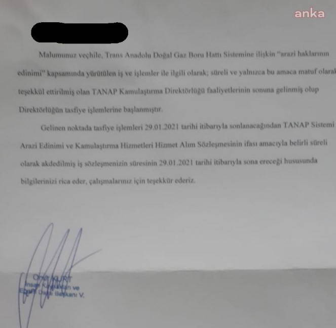 Çalışanlara gönderilen fesih bildirimde ise “TANAP Kamulaştırma Direktörlüğü faaliyetlerinin sonuna gelinmiş olup, direktörlüğün tasfiye işlemleri başlamıştır. Gelinen noktada 29 Ocak 2021 tarihi itibariyle sonlanacağından TANAP Sistemi Arazi Edimi ve Kamulaştırma Hizmetleri Hizmet Alımı Sözleşmesinin ifası amacıyla belirli süreli olarak akdedilmiş iş sözleşmesinin süresinin 29 Ocak itibarıyla sona ereceği bilgilerinizi rica eder, çalışmalarınız için teşekkür ederiz” denildi.