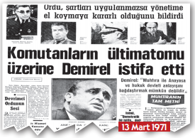 11 Şubat günlü TÖS Danışma Kurulu toplantısının saptamaları çok çarpıcı. Genel Başkan Fakir Baykurt, “Faşizm gelmiştir. Aklı başında hiçbir insan bu düzenin yananda olamaz”, Senatör Yıldız “Beygir kafasıyla iş yapılan memlekette, elbette öğretmene yular takılacaktır” demişler. 6 Mart günlü gazetenin manşetinde ODTÜ’nün yine bir savaş alanına döndüğünün, 22 kişinin yaralandığının gelişmeleri ile çarpıcı fotoğraf görüntüleri var.. Kestirmeden bıktırmama adına daha fazla söze gerek kalmadığı ile yetinerek 11 Mart ile 12 Mart askeri darbesinin ertesi günü, 13 Mart günü yayımlanmış gazetenin birinci sayfalarının kupürleri ile nokta koyalım mı dersiniz?..
