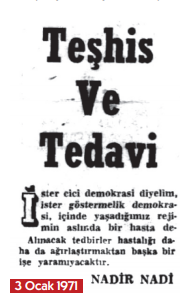 İsterseniz gelinmiş noktada, aynı günün tarihini taşıyan Nadir Nadi’nin “Teşhis ve analiz” başlıklı yorumuna bir göze atalım; “İster cici demokrasi diyelim, ister göstermelik demokrasi, içinde yaşadığımız rejimin aslında bir hasta demokrasi olduğu, artık şüpheye yer bırakmayacak biçimde anlaşılmıştır..” diye söze giriyor. Sunay’ın “Takriri Sükûn” devrini anımsatan önerisini de eleştiriyor, “İyileştirelim derken hasta demokrasiyi öldürmekten başka ne sonuç verebilecektir” sorgulamasını yapıyor. 27 Mayıs düşmanları, eski DP mirasçıları, ırkçılar, turancılar, din tüccarları ve benzerlerine danışmanın sonucunu, “Bu devrim düşmanlığıdır, bilim düşmanlığıdır, 27 Mayıs düşmanlığıdır” olarak tanımlıyor.