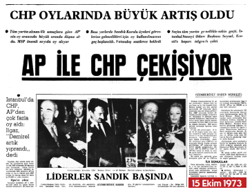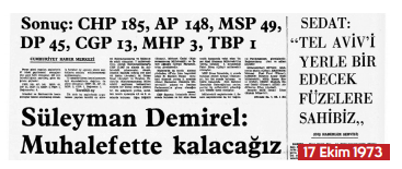 14 Ekim 1973 günü, 450 milletvekili, 52 senatörlük için oy kullanma hakkı olan 17.5 milyon vatandaş, seçmen olarak sandık başına gidiyor. 15 Ekim günlü sayfamızda CHP’nin oylarında büyük artış olduğu bilgisi var. Cumhurbaşkanı Korutürk, Ecevit ve Demirel’in oy kullanma fotoğrafları paylaşılmış. 16 Ekim tarihli manşetimizde CHP’nin seçimi kazandığı, sonuçların partiler arasında şaşkınlık yarattığı paylaşılmış. 17 Ekim tarihli gazetemizde seçim sonuçlarına göre partilerin kazandıkları milletvekili sayıları ile birlikte Demirel’in ön alarak muhalefette kalacakları açıklaması var. MSP’den gelen açıklama ise uygun bir protokolle koalisyonun olabileceği yolunda.