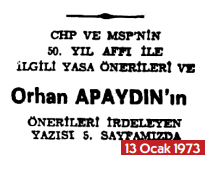 25 Ocak tarihinde kurulan Ecevit - Erbakan, CHP- MSP hükümetinin 26 Ocak tarihli Cumhuriyet’in iki tam sayfasında yer alan kabinesi, ulusal bağımsızlıkçı ilkeler etrafında toplanmış ilkeleri bir yana, af üzerinden aylar süren ve hükümetin kuruluşunu da geciktiren gelişmeleri, o gün için basının gündemine taşınmamıştı. Gerçeğinde tartışmaları, ayrışmaları Cumhuriyet’in ağırlıklı gazeteci ve hukukçu yazarlarının gündeminde, titizlikle izlenmekteydi. Paylaşacağımız 13 Ocak tarihli Cumhuriyet’in 1. sayfa kupüründen göreceğiniz üzere hukukçu kimliği, her dönem bağımsız yargı, düşünce özgürlüğü kimlikli savaşımları, Barolar Birliği Başkanlığı içinde, tutukluluklarıyla bilinen Orhan Apaydın, CHP ve MSP’nin sonuçta ayrı ayrı hazırlamış oldukları 50. yıl affı ile ilgili önerilerini, gazetenin 5. tam sayfasında ana hatlarıyla kamuoyuna sunuyor. İmkânsız karşıtlıkların olmadığı sonucuna varıyor. MSP’nin özgürlükçü düşünce özgürlüğüne yakınlığının görülmesi ile CHP’nin görüşüne katılmasının beklendiğinin altını çiziyor. Cumhuriyet okurlarına yeniden tanıtmanın gereği yok. Halit Çelenk, 15 Ocak tarihli gazetemizin ikinci sayfasındaki “Genel Af ve Bir Madde” başlıklı yazısında, sonuç olarak af yasası metninde, 141-142. maddeler suçlarının ayrılmış olarak yer almış olmasının, söz konusu suçların başka suçlar maddeleriyle de birleşmesi nedeniyle çıkabilecek sorunlar, sakıncalar üzerinde duruyor. Çözümün ancak işlenmiş suçlar ayırımının yapılmaması üzerinden olabileceğinin altını çiziyor.