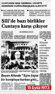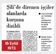 Allende’nin devrimi, direnişi, yaptıklarıyla sadece kendi ulusuna değil, Güney Amerika ülkelerinin uluslarına, dünyaya unutulamayacak ders- ler verdiğinin altını çiziyor. Şili’de yaşananların ülkemiz ve dünya için unutulmazlığının bir belgesini daha yine 16 Eylül tarihli birinci sayfadaki Şili haberinin kupürü ile paylaşalım..
