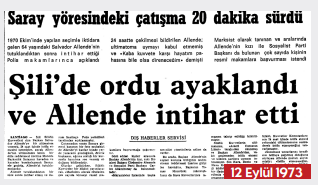Tarihe not düşmeden geçmek olanaksızdı. Dünya ve ülkemiz için çok geçerli 12 Eylül travmalarından bir örnek daha gibi de.. 12 Eylül 1973 tarihli Cumhuriyet gazetesinin manşetindeki başlıkları paylaşmak, yeterince çarpıcı, ders verici. 13 Eylül günlü manşetimiz, Allende’ye bağlı işçilerin cuntaya karşı direnişlerinin gelişmelerini özetliyor. 15 Eylül günlü Şili gelişmeleri manşetimizde ise birden çok yönlü gelişmelerin haberlerinin başlıklarını olsun okurla paylaşmak istedik. Oktay Akbal’ın 16 Eylül tarihli “Evet Hayır” köşesinin “Ölerek Yaşamak...” başlığı altındaki yazısı gerçek bir edebiyatçı düşünürün, insan yaşamının her haline ilişkin gözlemlerini okuyabilmek adına çok değerli.