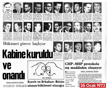 26 Ocak tarihli Cumhuriyet’in manşetinde Ecevit-Erbakan ikilisinin koalisyon hükümeti üyeleri tanıtılıyor. İkilinin 109 maddelik koalisyon protokolü açıklamaları, tek başına, başlıklarıyla bile ulusalcı çizgide bir koalisyonun ilkelerinin altının çizilmesi içerikli.