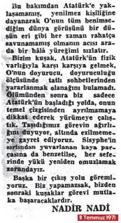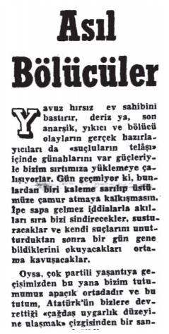 Nadir Nadi, yavuz hırsızın ev sahibini bastırması örneğiyle, Atatürk ilkelerinden ödün vermemekte öncülük yapan Cumhuriyet’e dönük Atatürk düşmanlarından gelen yıkıcı ve bölücü çabalardan örnekler verir. 12 Mart öncesinde birden ortaya çıkan terör ve provokasyonların da bu türden araç olarak kullanılması gerçeğinin altını çizer.