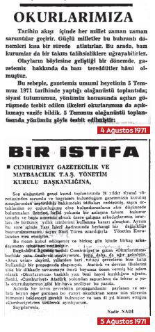 Ve Nadir Nadi söz verildiği halde yazarlar ve çalışanların işten atılmaları sözünden dönülmesi üzerine 4 Ağustos tarihi ile gazeteden istifa etmek gereğini duyuyor. Duyurusu 5 Ağustos tarihi itibari ile yapılıyor.