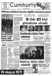 Banka soygunları üzerinden, provokasyon kokan birbirinden çarpıcı haberler, veznedarın tabancasının incelenmesine uzanan bilgilendirmeler manşetten paylaşılacak kadar önemli. Öğretmen tutuklamaları, yargıçların baskılarına ilişkin haberler yarışıyor. 19 Mayıs tarihli Cumhuriyet yine paylaşılmalı ki, hükümet bildirisi üzerine yaşanan gelişmeler algılanabilsin. 19 ilde, 427 kişi gözaltına alınırken bilge bilim insanları, yazarların, sendikacıların isimleri yarıştırılmış gibi. İdam tasarısının bile hazırlanmakta olduğu duyurulmuş.