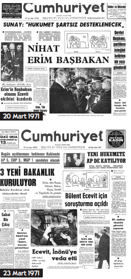 Tam da geçmişin MTTB başkanlarından, DP’nin grup başkanı Rasim Cinisli’nin odasında aydınlanmacıların ortak imzalamış oldukları, demokratik haklar kaygılarına ilişkin metnin bir örneğini veriyor, çay kahvemizi içiyorduk ki.. Radyo haberlerinde, 12 Mart darbesinin öncü askeri muhtıralarından biri okunmaktaydı.. 12 Mart muhtırasının sonrası gelişmelere Nihat Erim’in Başbakan ilan edildiği 20 Mart tarihli Cumuhuriyet’in birinci sayfasının haberleri ile girmek, 23 Mart’la devam etmek öğretici olabilir.