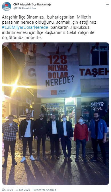 CHP Esenler İlçe Başkanı Bülent Ütebay, polisin CHP'nin "128 milyar dolar nerede?" afişinin kaldırılmasını sosyal medya hesabından paylaştığı görüntülerle şöyle duyurdu: "Pankartımızdan çok korktular ama asıl korktukları Pankartımızdan altındaydı #AsılKorktukları #AsılKorkuları"