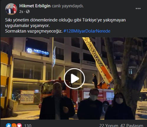 Ardından polisler il başkanlığı binasının balkonunda asılı olan pankartı kaldırırken Adem, "Sevgili arkadaşım, sizi de yoracağız ama biz bu soruyu sormaya devam edeceğiz. Maalesef Türkiye'de 128 milyar doları sormak suç oluyor. Yazık, bütün Türk milleti adına sorduk, sormaya da devam edeceğiz. 128 milyar dolar nerede?" diye konuştu.