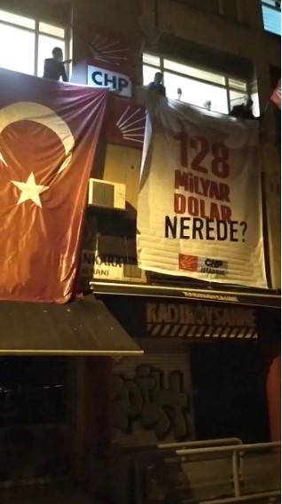 Ataşehir'de polis ekipleri CHP ilçe binasının önüne getirdikleri vinçle, 'CHP'nin 128 milyar dolar nerede?' afişini kaldırdı.