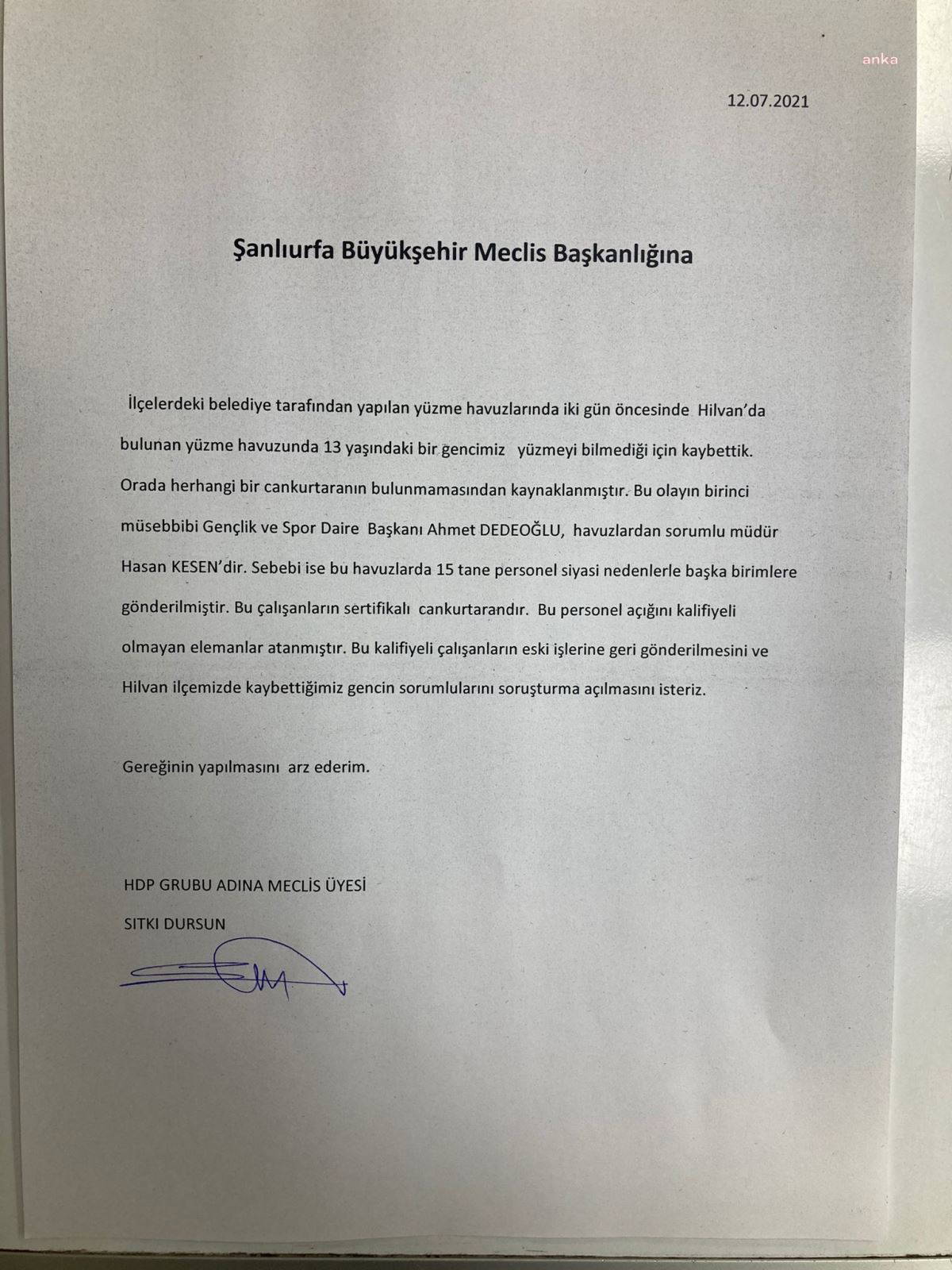 Söz konusu iddia, Şanlıurfa Büyükşehir Belediyesi Meclis toplantısında HDP’li Meclis üyesi Sıtkı Dursun'un verdiği önerge ile ortaya atıldı.