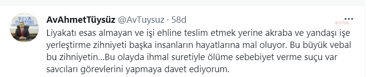 DEVA Partisi İl Başkanı Ahmet Tüysüz'de Twiiter’dan konu ile ilgili açıklama yaptı. Tüysüz açıklamasında, “Liyakatı esas almayan ve işi ehline teslim etmek yerine akraba ve yandaşı işe yerleştirme zihniyeti başka insanların hayatlarına mal oluyor” ifadelerini kullandı.