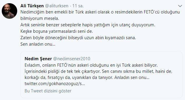 Gökhan Özoğuz'a "Evladım, onların FETÖ’nün askeri olduğunu en iyi Türk askeri biliyor. İçerisindeki pisliği de tek tek çıkartıyor. Sen canını sıkma bu millet, haini de, korkağı da, fırsatçıyı da, uyanıkları da tanıyor. Anladın sen onu..." diyen Şener'e Balyoz davası sanıklarından emekli kurmay albay Ali Türkşen cevap verdi.