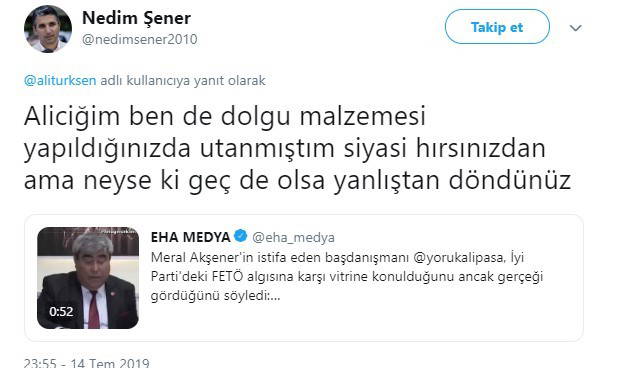Şener ise Türkşen'e cevaben "Aliciğim ben de dolgu malzemesi yapıldığınızda utanmıştım siyasi hırsınızdan ama neyse ki geç de olsa yanlıştan döndünüz" dedi.